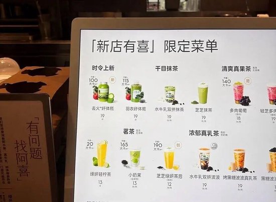 2025全年喜茶联名次数由2024年的14次降至5次。在产品层面打出“超级植物茶”概念,围绕绿色饮食大做文章。并且推出了“木姜子滇木瓜”“芝士咸酪藏茶”“芭乐雪毫茉王”“三倍厚抹”等多款个性新品,价格也回升到20-25元区间。
